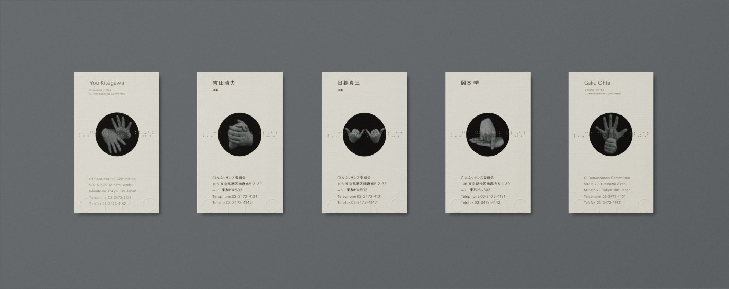 By portraying the sign language as symbols, I powerfully visualized the CI Renaissance Committee, which is a reflection of my ideology and philoso- phy. In addition, the braille logotype in contrast with concrete photographed symbols became abstracted, and by integrating them together, a one-of- a-kind Mark and stationery design was born.