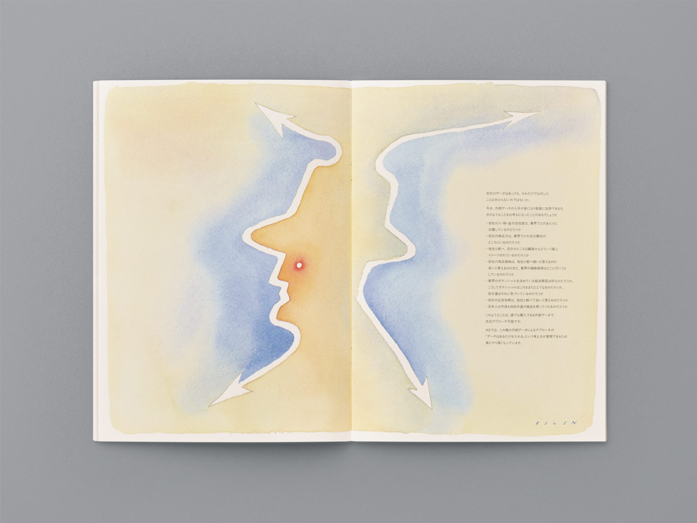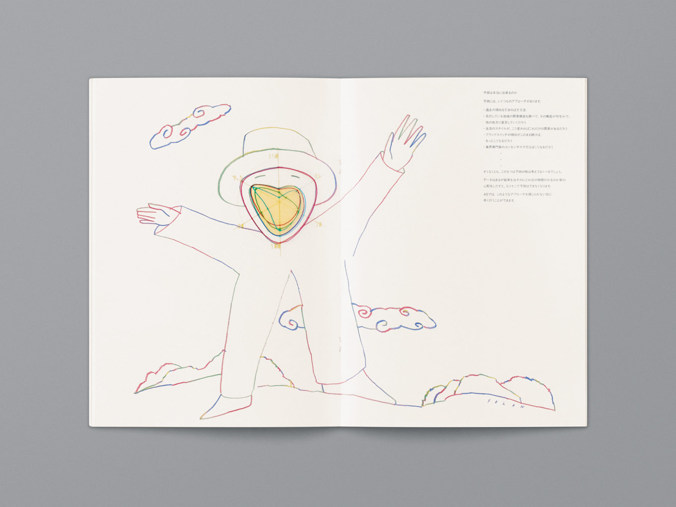 No one ever imagined applying Folon’s watercolor illustrations to the design of cor- porate business cards, letterheads, and envelopes. Folon himself was quite surprised and emotionally moved by the outcome of our collaboration when I showed him the completed stationeries. When I met Milton Glaser in New York for the first time, I showed him the stationery; he just said, “Great,” and then went on to start showing me all of his CI works. Milton Glaser’s masterpiece is the logo design of“I LOVE NEW YORK.”My CI design and Milton Glaser’s design have two things in common: unprecedented ideas and originality.